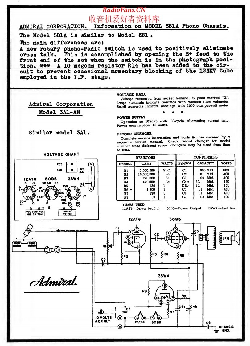 ADMIRAL - 3A1-AN - Mono Phonograph - Schematic Diagram 电路图 维修手册