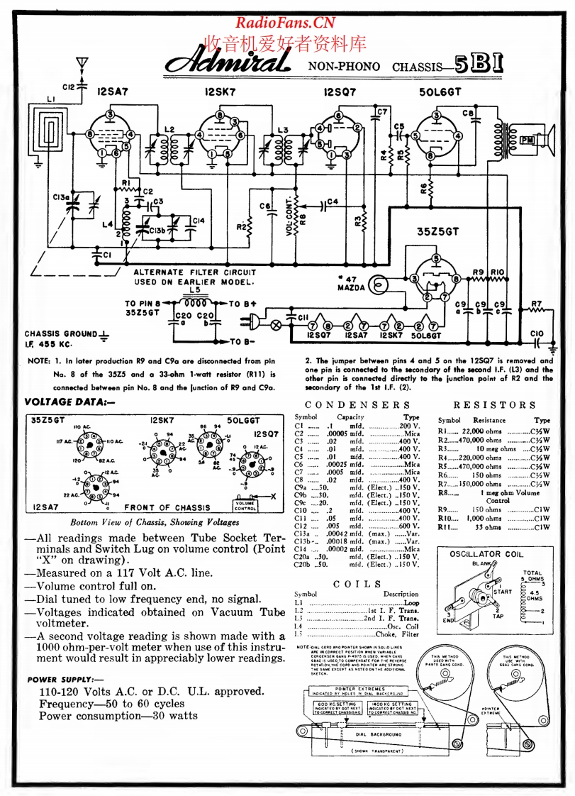 ADMIRAL - 5B1 - Mono Phonograph with AM Radio - Schematic Diagram and Adjustment 电路图 维修手册