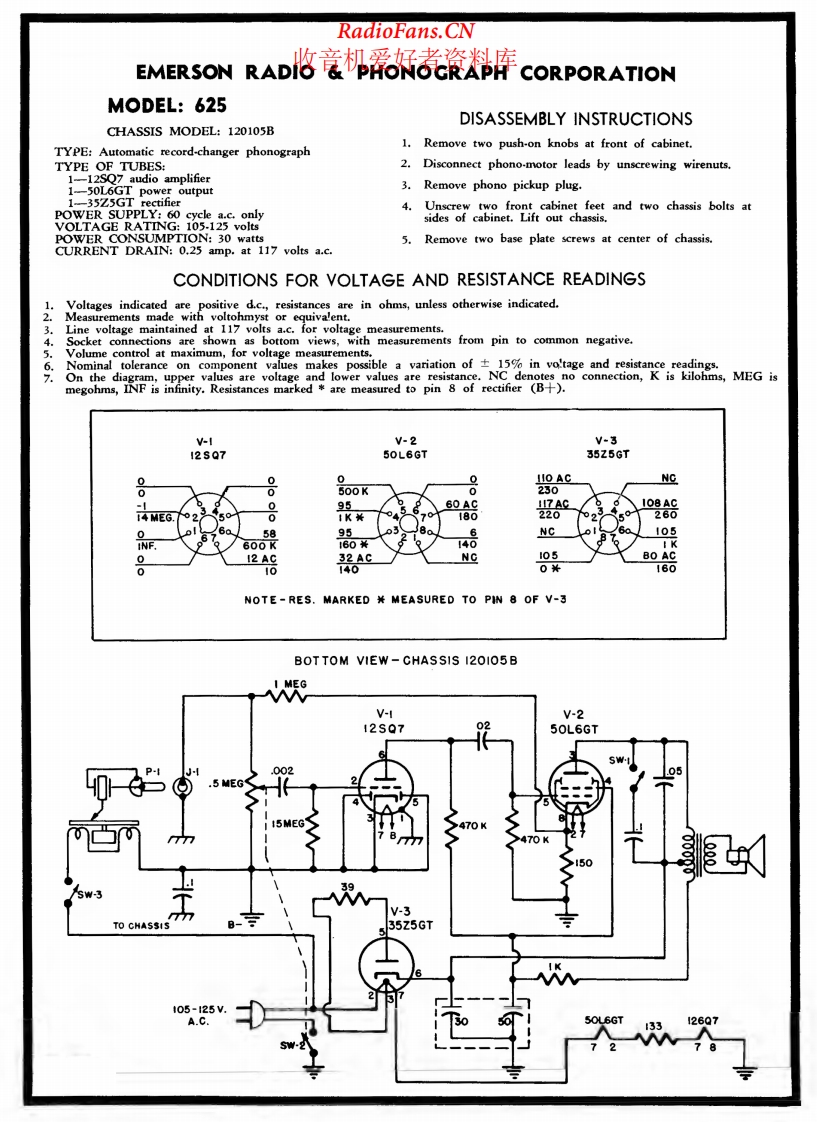 EMERSON - 625 - Mono Phonograph - Schematic Diagram 电路图 维修手册